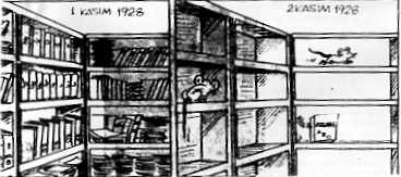 " Hitler'in çagdasi olan Mustafa Kemal ise, hedefini gerçeklestirmek için en basarili ve en akilli yolu tutmustur. Türkiye'nin Baskani, vatandaslarinin eskiden miras aldiklari kültür ve medeniyetin havasindan kafalarini kurtarip çopk kuvvetli bir sekilde Bati medenyietinin potasi içinde sekil almalarini istemistir. Böylece alfabenin degisimi, kütüphanelerin yakilmasi yerine geçmisti. " Bundan sonra Türk kütüphaneleri yakmaya hiç gerek kalmamaktadir. Çünkü harf inkilâbiyla bu hazineler, örümceklerin yuva yaptigi raflarda kapanip kalmaktan baska bir seye yaramyacaktir. Ancak çok yasli hocalar ve ihtiyarlar, onlari okumak lüzumunu hissedecektir. |